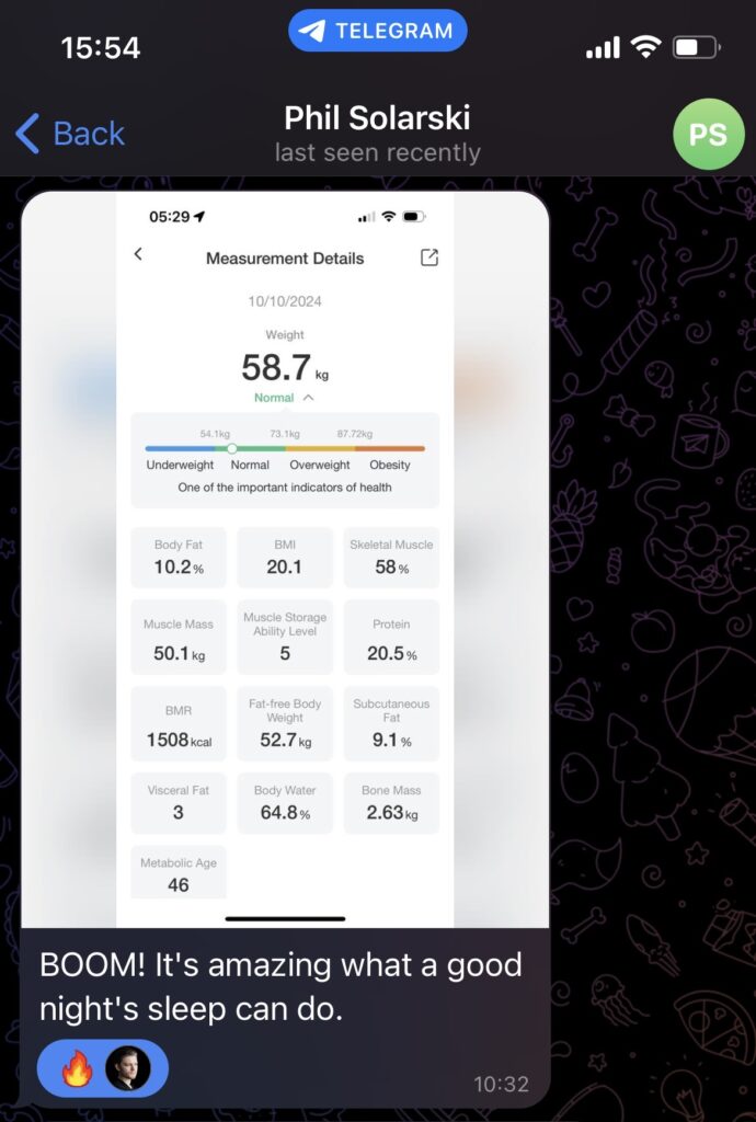 - Long-Term Accountability — With daily weigh-ins, weekly check-ins, and meticulous logging, Phil stayed accountable throughout, no matter where he was traveling for work.