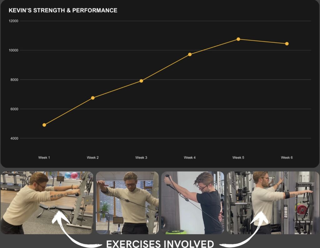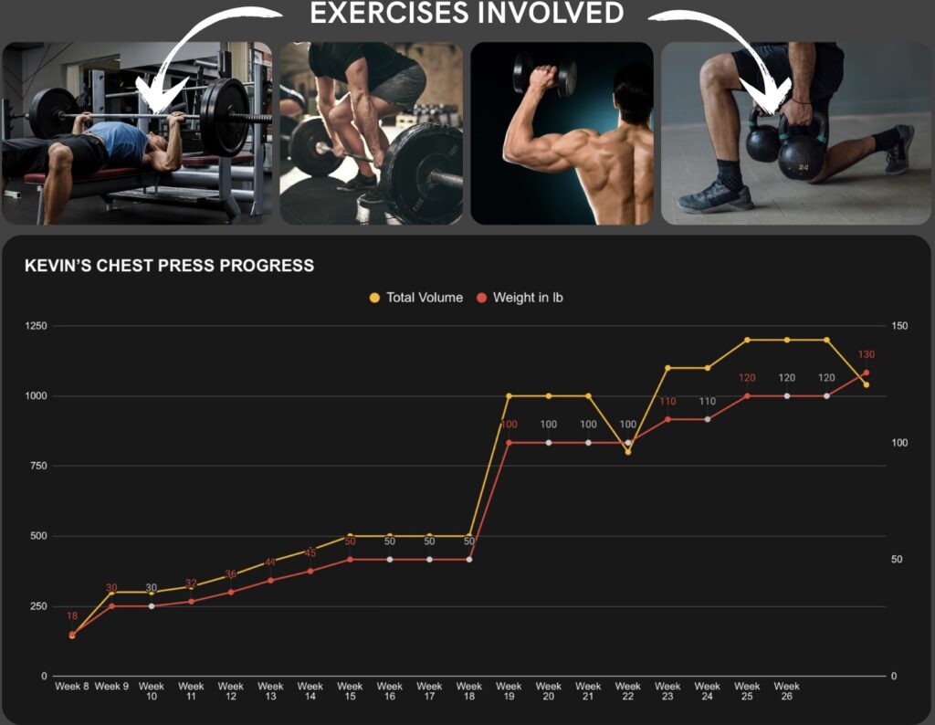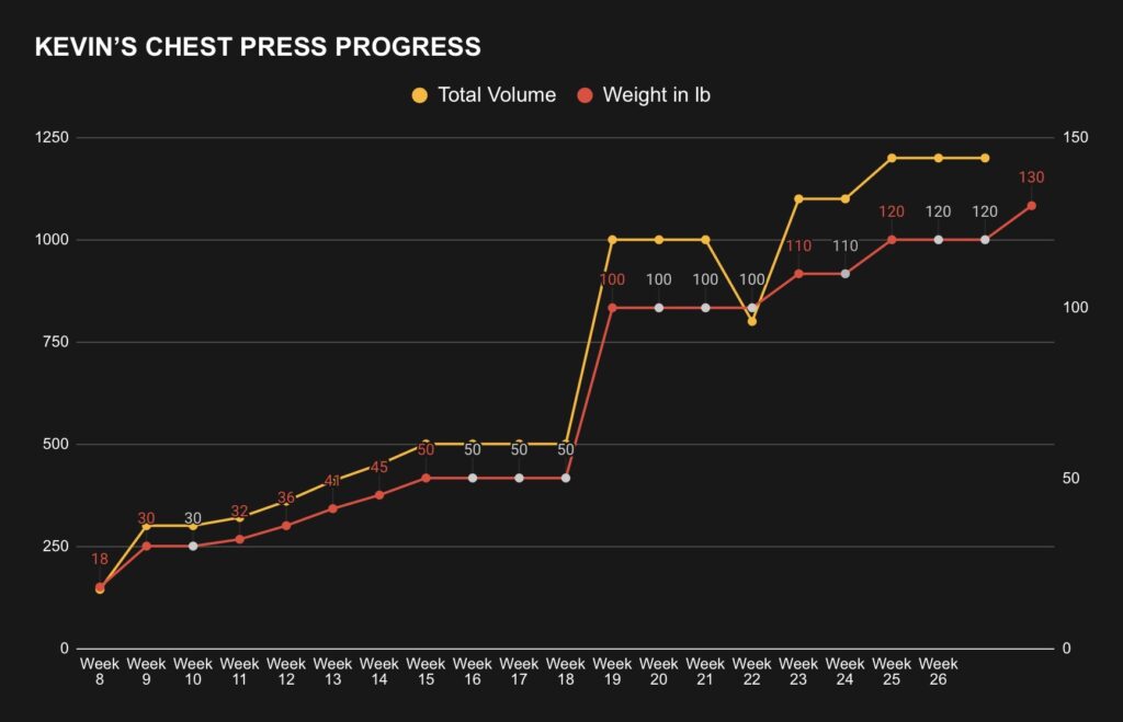 Kevin goes from struggling to chest press 18lb to 130lb with confidence in 18 weeks — a 7x increase)