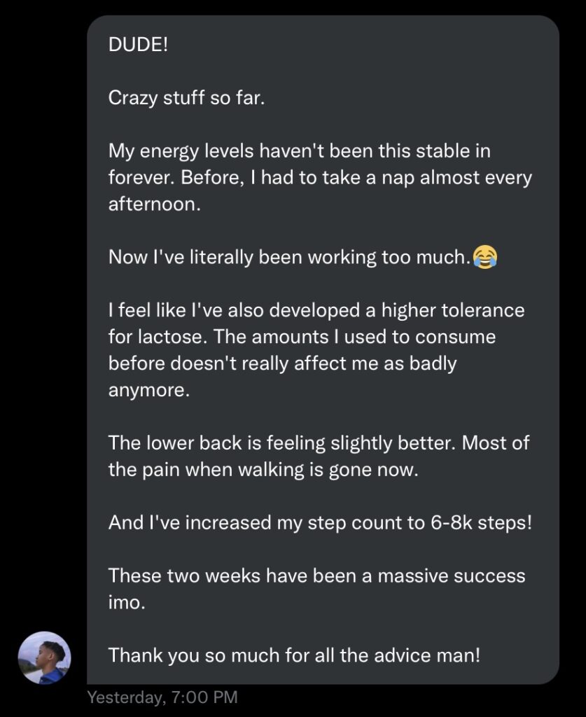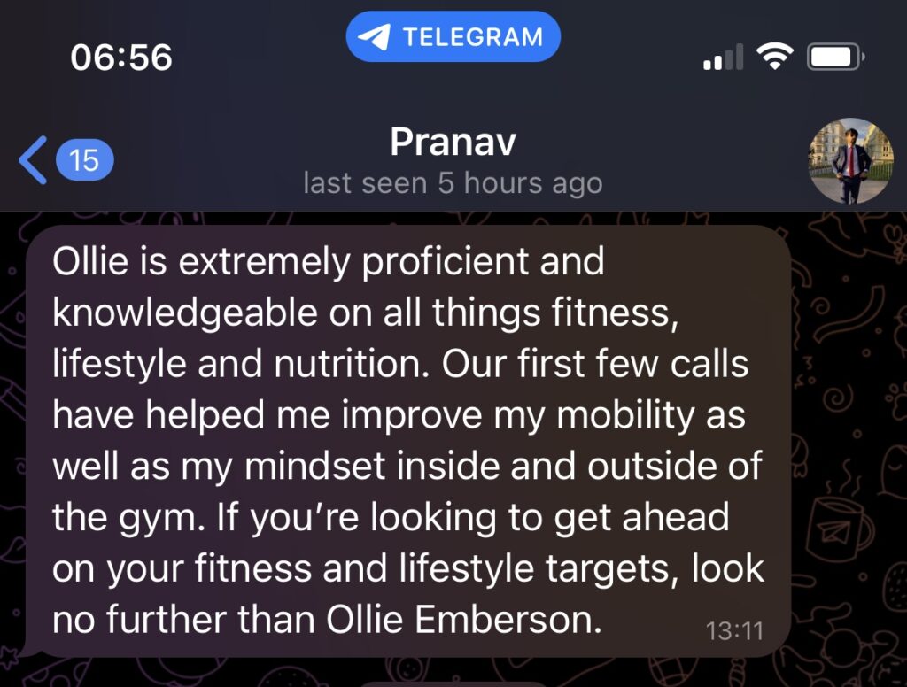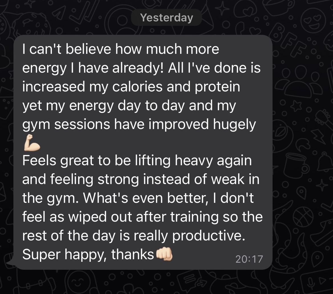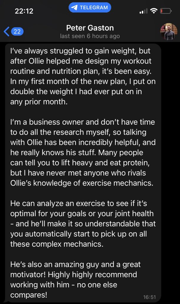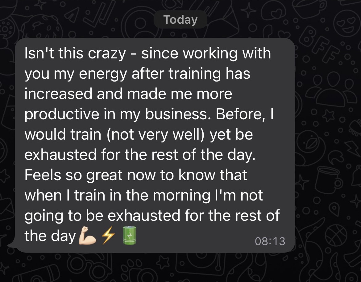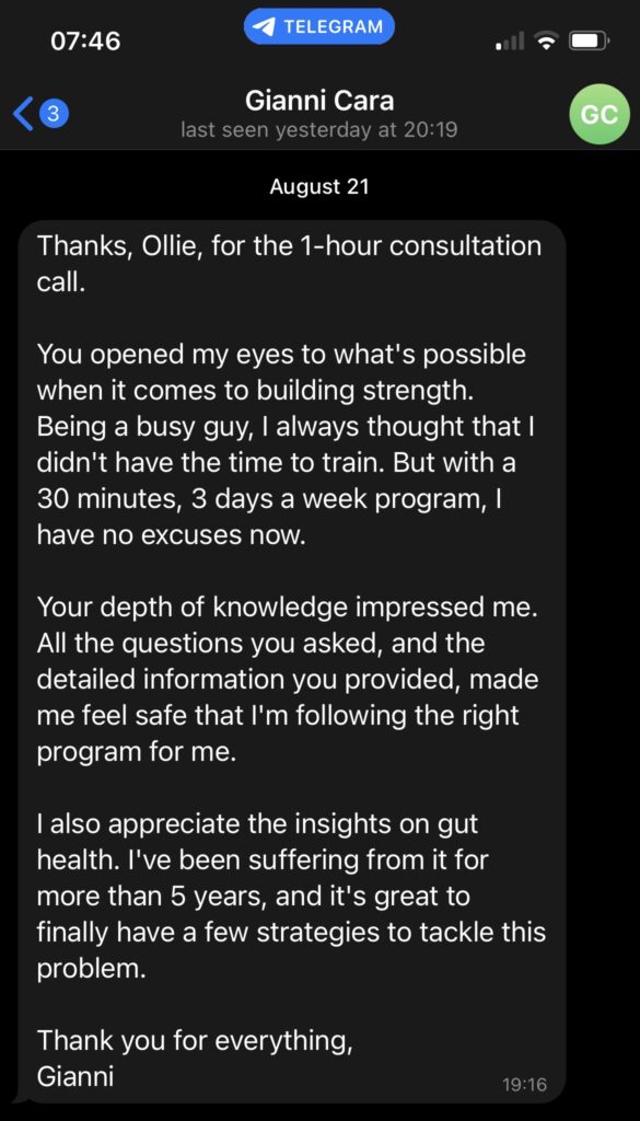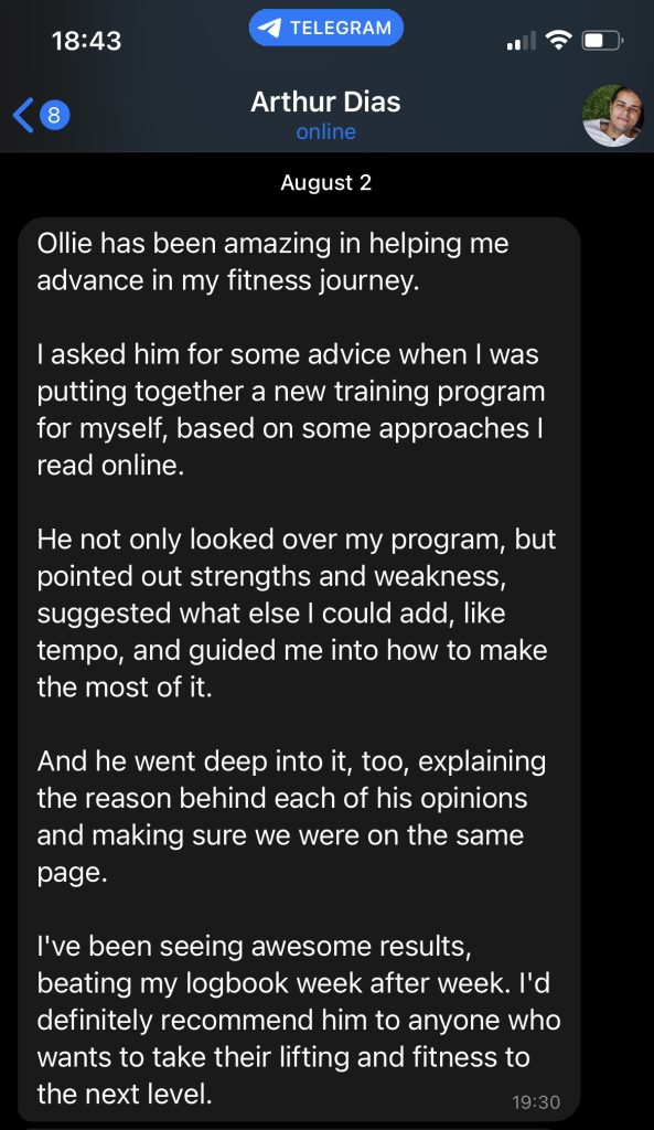 Unlimited access to me via telegram for 8 weeks after package end, accompanied with program updates to help keep you on track.
