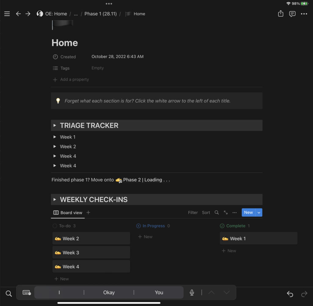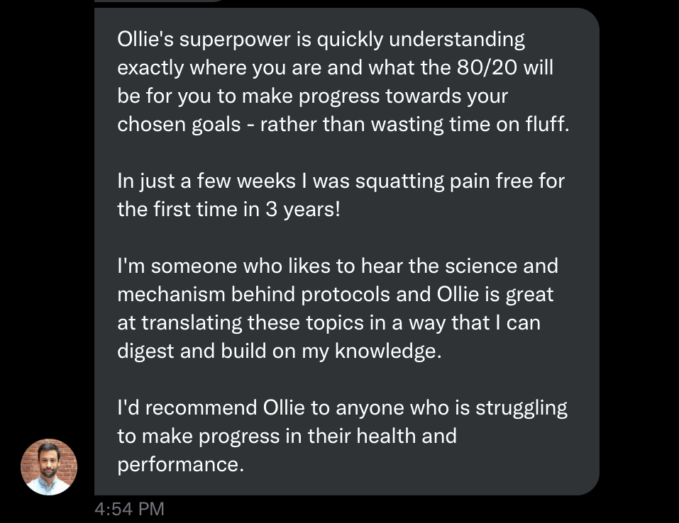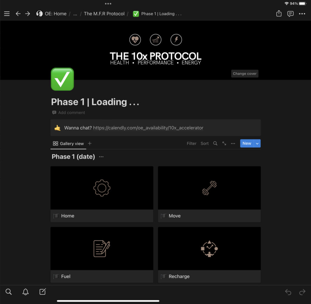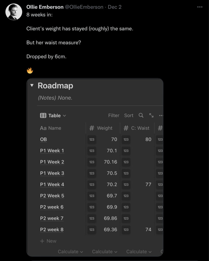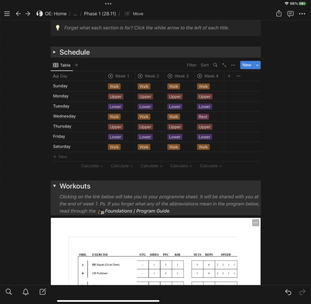 Onboarding: get used to Notion systems, tracking & introduce foundational habits surrounding exercise, nutrition & recovery with weekly calls & check-ins.