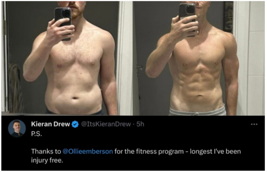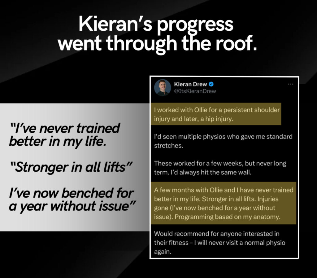 Kieran is a (very) well known entrepreneur with 214,000 followers on Twitter, who joined my program with persistent shoulder issues, which first began when he started lifting 10 years ago.