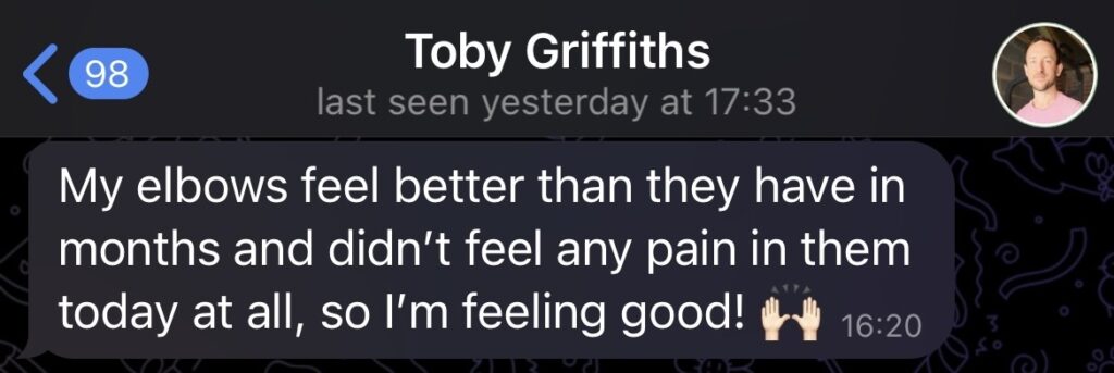 Toby (a UK based biz-owner and father) suffered with elbow, back, and shoulder pain for years. He was unable to push hard or progress in the gym… and he was worried his body was breaking down at 40.