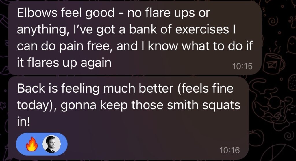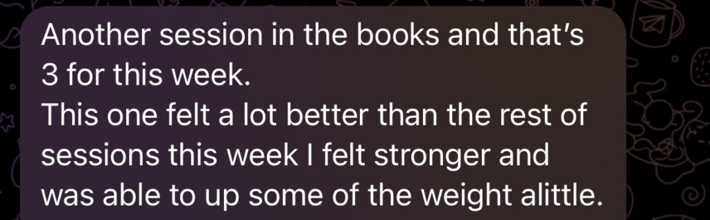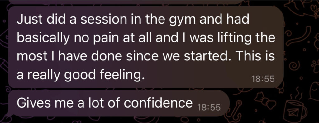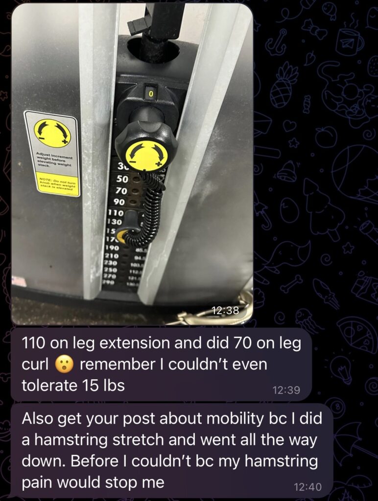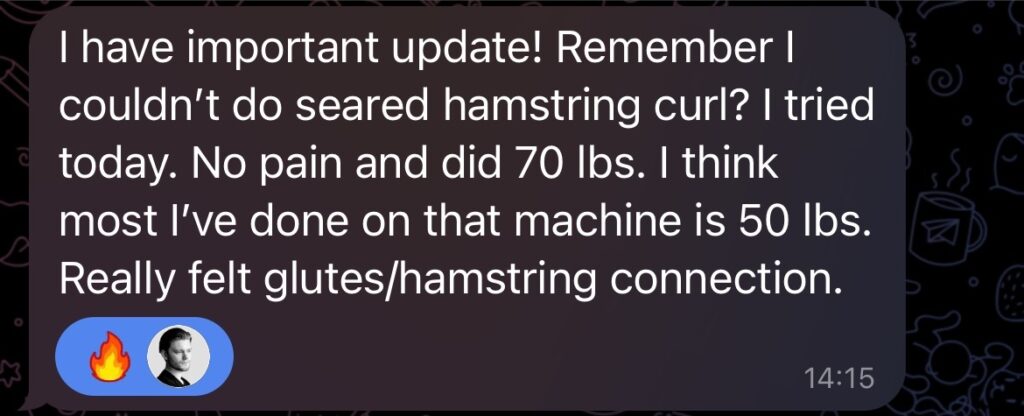 When we started, my hamstring pain stopped me from doing a lot, and I couldn’t tolerate more than 15lbs on hamstring curls. Now, I’m pain-free and lifting 70lbs, something I never thought I’d achieve.