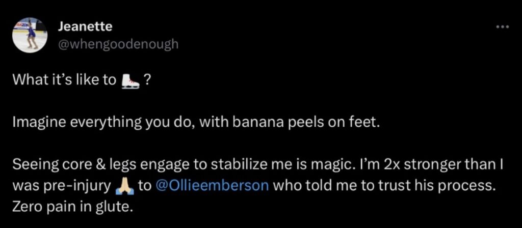 Jeanette, a professional ballerina and nationally ranked skater, had battled chronic left hip pain that disrupted her skating and daily life. Despite past rehab efforts, she feared long-term damage and didn’t know where to turn.