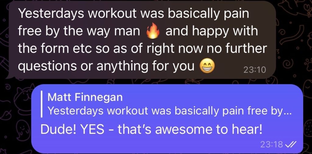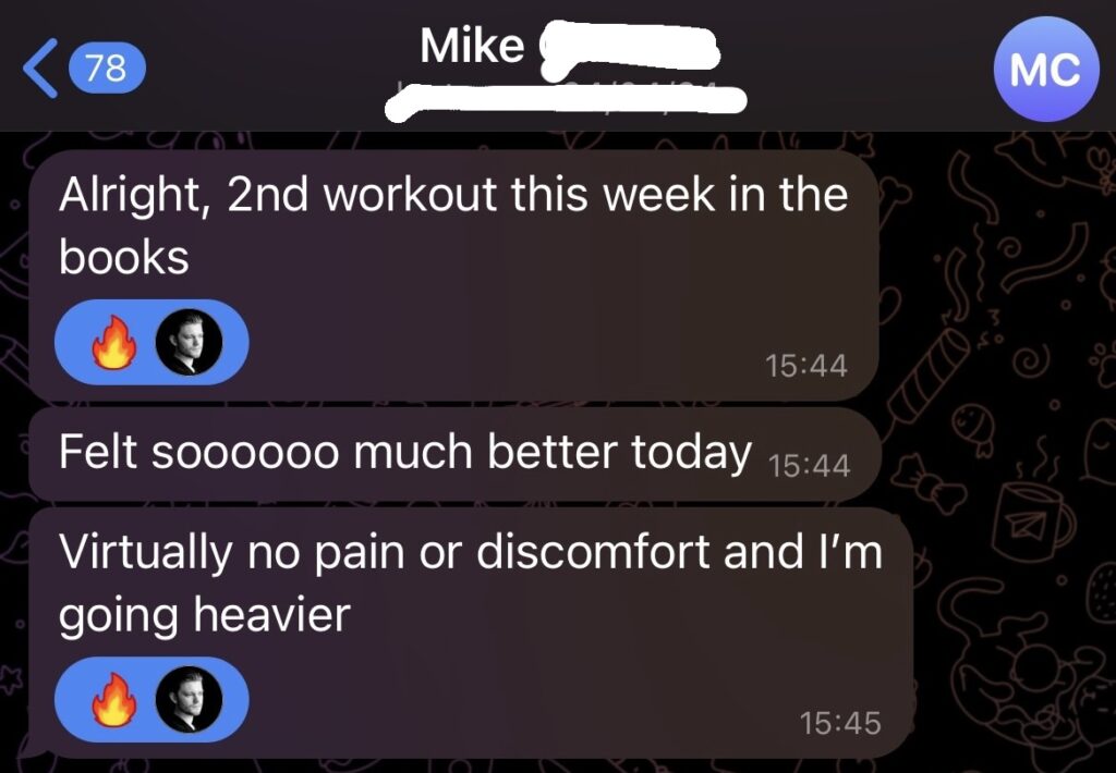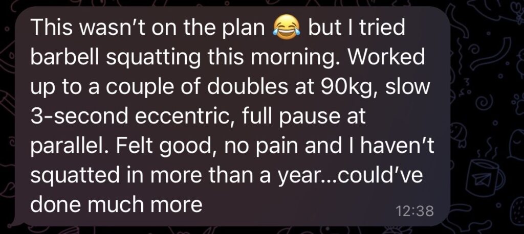 4 weeks into the program: He was back to pain-free training, able to start progressing for the first time in 4 years and now.