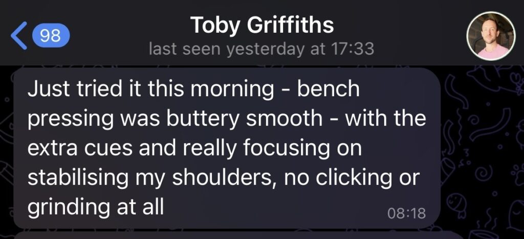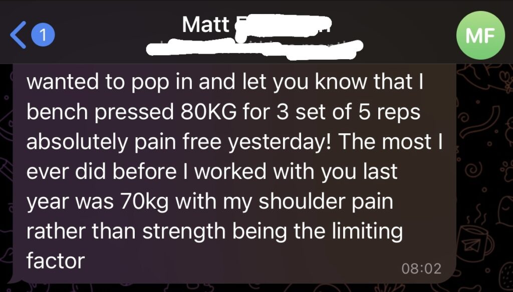 4 weeks in, I had less pain in day to day life and my workouts were completely pain free. Months later and I’m benching 80kg without any issues. Ollie’s program has been a massive positive impact on my life.