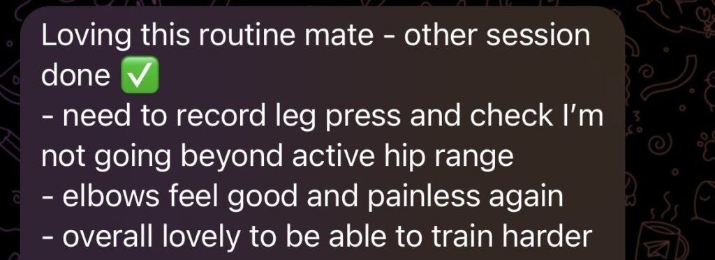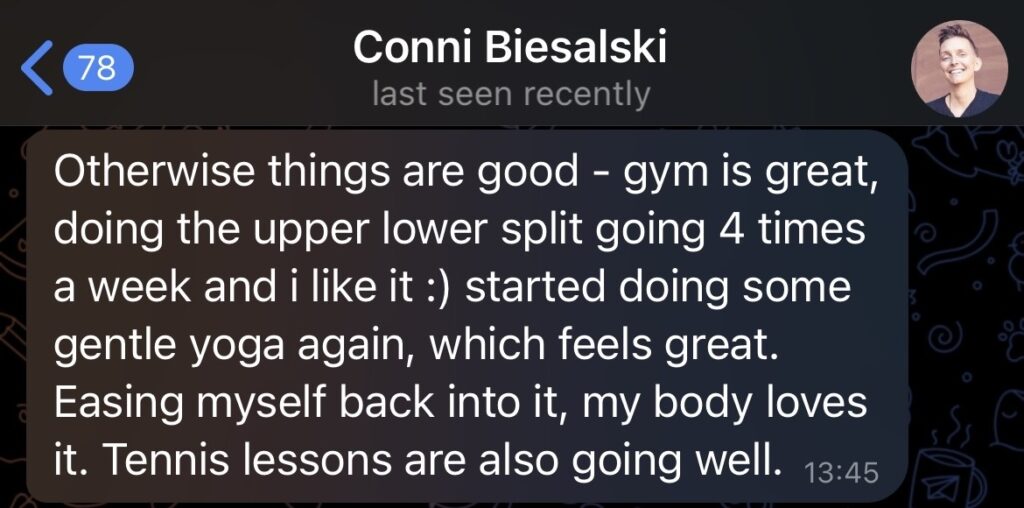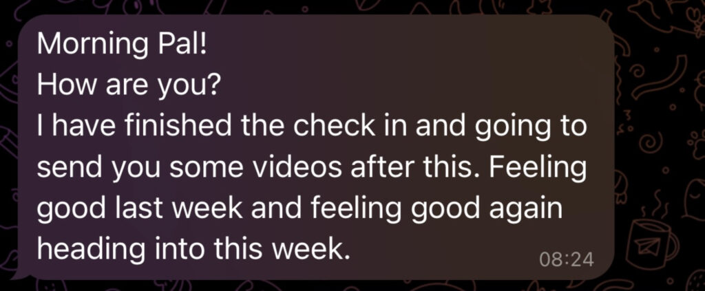 Responsiveness and feedback on Telegram for technique, exercise execution and problem solving were also great.