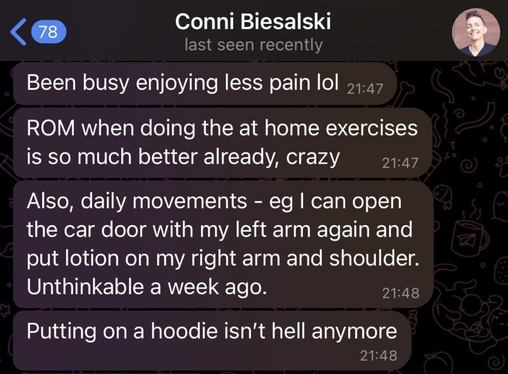 Conni (Portugal-based business owner) struggled with frozen shoulder pain that restricted her mobility and disrupted her yoga, workouts, and daily tasks… like putting on a sweater.