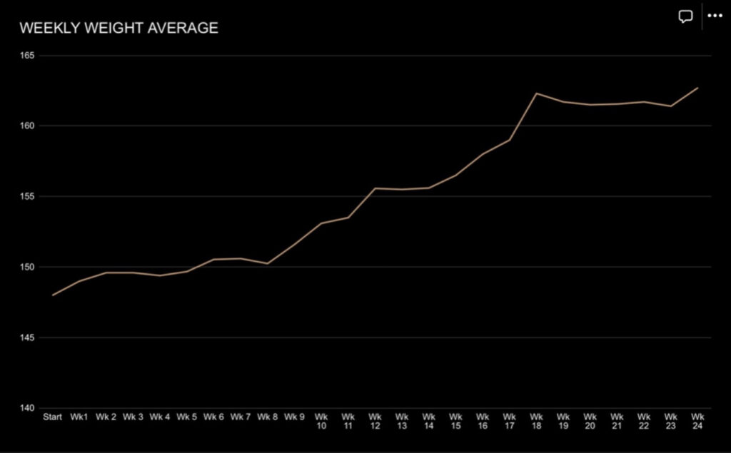 I felt I was doing a lot of "work" and the "right" things but not seeing much growth or progress. I had worked out consistently for the last ~8 years and yet had remained between 145-152 pounds. I knew I could do more.