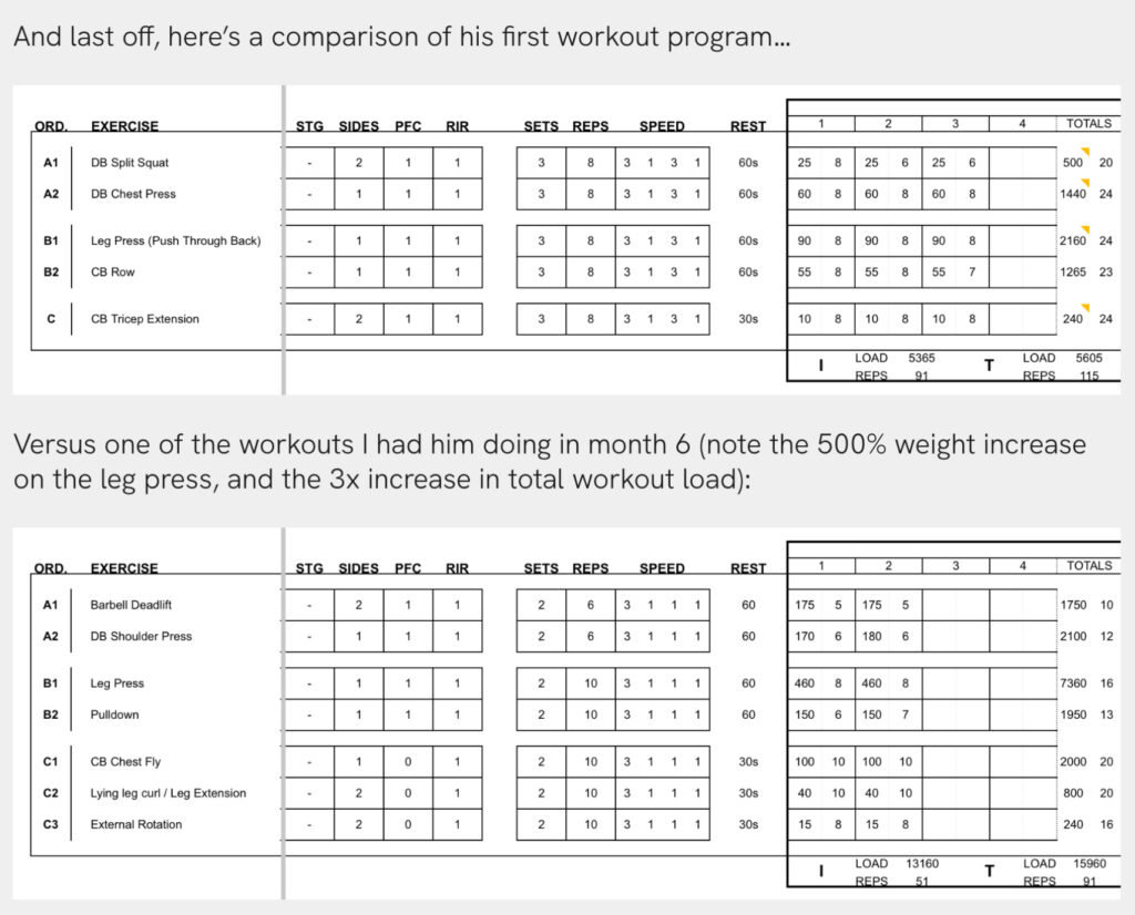 He was training his legs hard for the first time since college. He gained ~15 pounds while remaining similarly lean, his strength improved across all exercises (particularly with his legs where he doubled his PR in some cases)